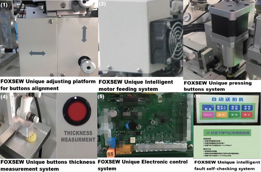 (4) FOXSEW Adopte automatiquement le système, si la taille des boutons est différente, appuyez simplement sur un bouton et mettez facilement un bouton dans la plaque de mesure d'épaisseur avec commodité. À propos de la machine similaire sur le marché, tous ont fait fonctionner ce système manuellement, perdent du temps et sont peu pratiques à utiliser.
