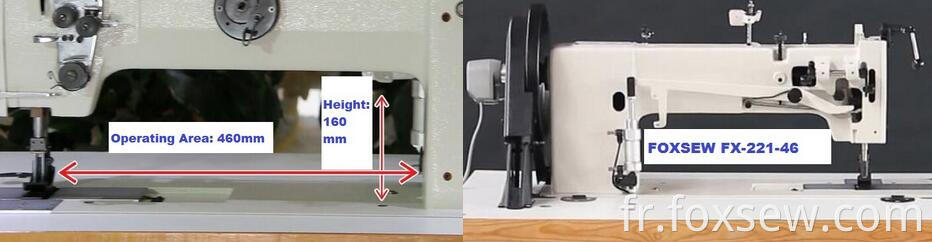 FOXSEW FX-221-46 ARM Long Arm Double aiguille lit plat lit triple alimentation marche pied extra lourde machine à coudre Lockstitch pour le rembourrage en cuir et les webbings lourds, pour la couture de matériaux de poids très lourds tels que le cuir, le canapé, la toile, le vinyle, les synthétiques et divers Tissus revêtus, stratifiés et en caoutchouc. Convient à la couture telle que les tentes, les bâches, les auvents, les couvertures de camions, la marine auto et les meubles d'ameublement, les couvercles de terrain, les structures en tissu et les produits volumineux lourds.